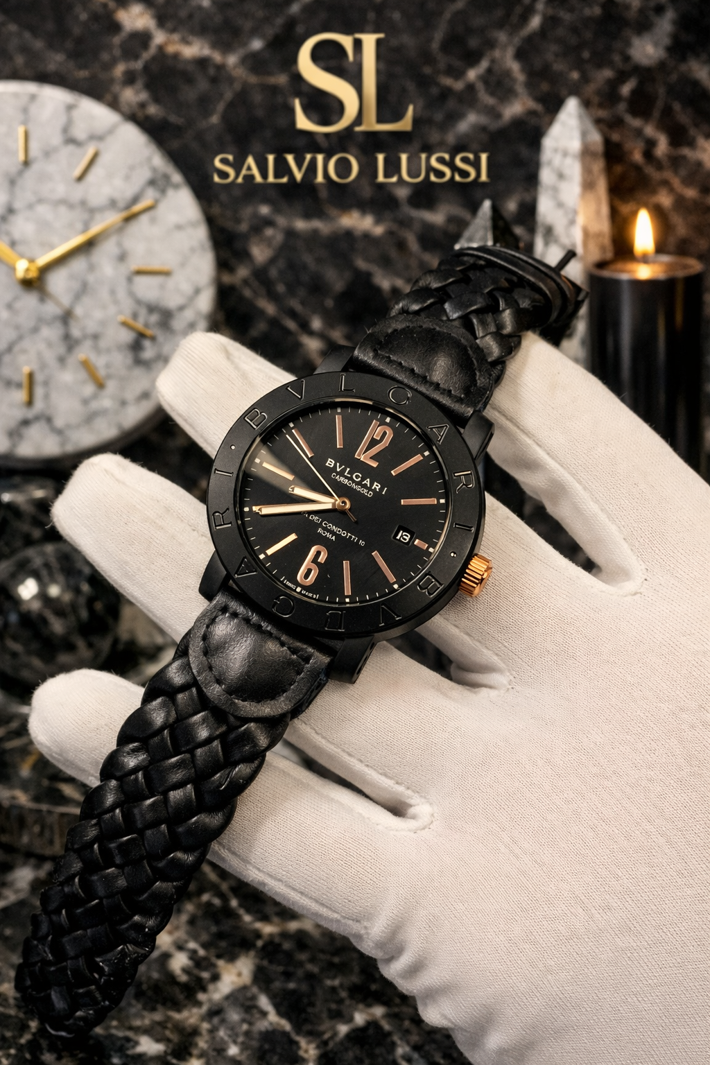 Orologio Bulgari Carbon Gold dal design sofisticato e contemporaneo, con cassa in carbonio e dettagli in oro per un’eleganza unica. Il cinturino in pelle intrecciata garantisce comfort e stile distintivo, mentre il quadrante minimalista e raffinato completa il look di lusso. Perfetto per chi cerca prestigio, innovazione e artigianalità Bulgari in un accessorio quotidiano.