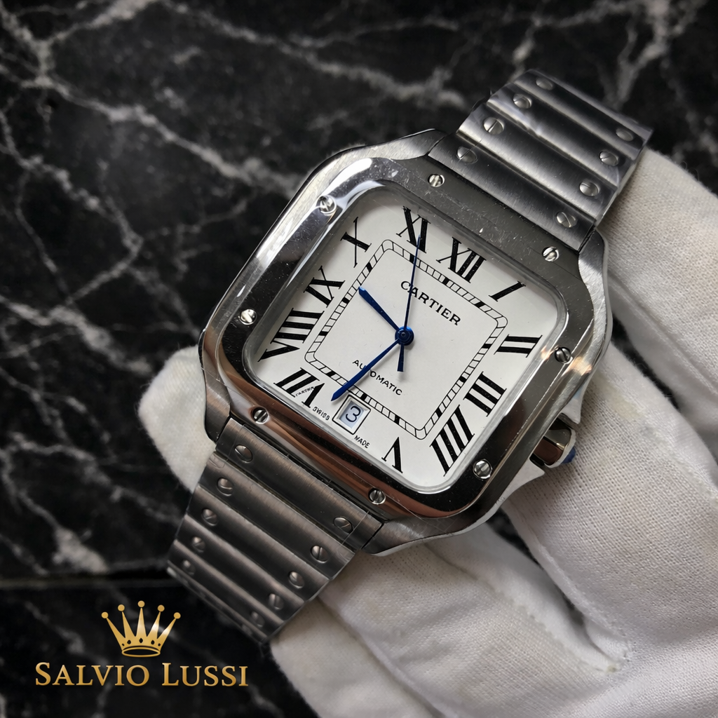 Orologio Cartier Santos in acciaio inossidabile con quadrante bianco elegante e raffinato. Design iconico con cassa quadrata e dettagli distintivi, perfetto per chi ama stile classico e lusso senza tempo. Movimento preciso e affidabile, adatto all’uso quotidiano o alle occasioni più eleganti.