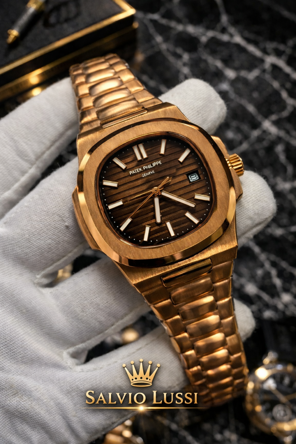Orologio Patek Philippe Nautilus in oro rosa, simbolo di eleganza senza tempo e prestigio orologiero. Design iconico con cassa ottagonale smussata, quadrante raffinato e cinturino integrato in oro rosa. Movimento automatico di precisione, perfetto per chi cerca lusso, stile distintivo e affidabilità in un segnatempo unico.