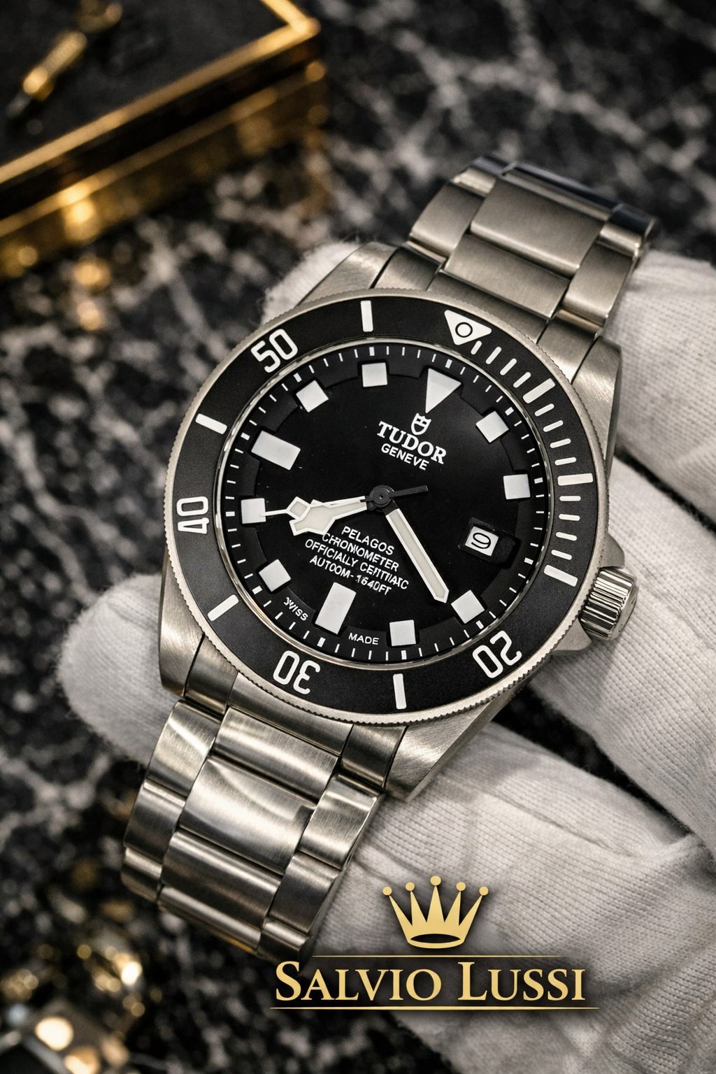 Orologio Tudor Pelagos in acciaio inossidabile con quadrante nero e lancette “Snowflake”, iconiche del marchio. Dotato di movimento automatico di alta precisione, cassa robusta e cinturino in titanio o acciaio con chiusura deployante, questo segnatempo subacqueo unisce resistenza, funzionalità professionale e design sportivo-lussuoso.
